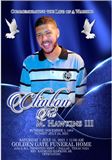 Processional……………………....Clergy, Pallbearers, & Family Hymn of Comfort……….………………….….. Everlasting Arms Scripture Readings: Old Testament…….……………………...…Psalm 145:17 New Testament……………………………..….John 14:27 Prayer …..………...…………………....... Raymond Hawkins, Sr. Solo................................................................. D’Juana Hawkins “ His Eye Is On The Sparrow” Resolutions………………………………........ Friends & Family Expressions of Love..…………………...Limit 2 Minutes. Please Special Remarks…………………………...Clinton Hawkins, Jr. Song ……………………………………...……...D’Juana Hawkins “Precious Lord” Eulogy…..………………………..…………… Raymond Hawkins Parting View…………………...…...Golden Gate Funeral Home Recessional Lesson #3: Be strong This is the hardest lesson of all. Because sometime life’s like an ocean sending big waves to make you fall. My dad was a fighter never knew the word NO. So, if something knocked him down he would get up and give it another go. As he looks down on us today, he says Mom and Pops, be strong it’ll all be ok. Brad keep your head up it’s gonna be ok. Chloe be the strength we all need because we all know all that toughness came from me. As I close this out, I’m sure you all know that my father Tre’ will be missed dearly by everyone here and sometimes the absence of something so comforting and familiar causes fear. But don’t be scared or sad or mad